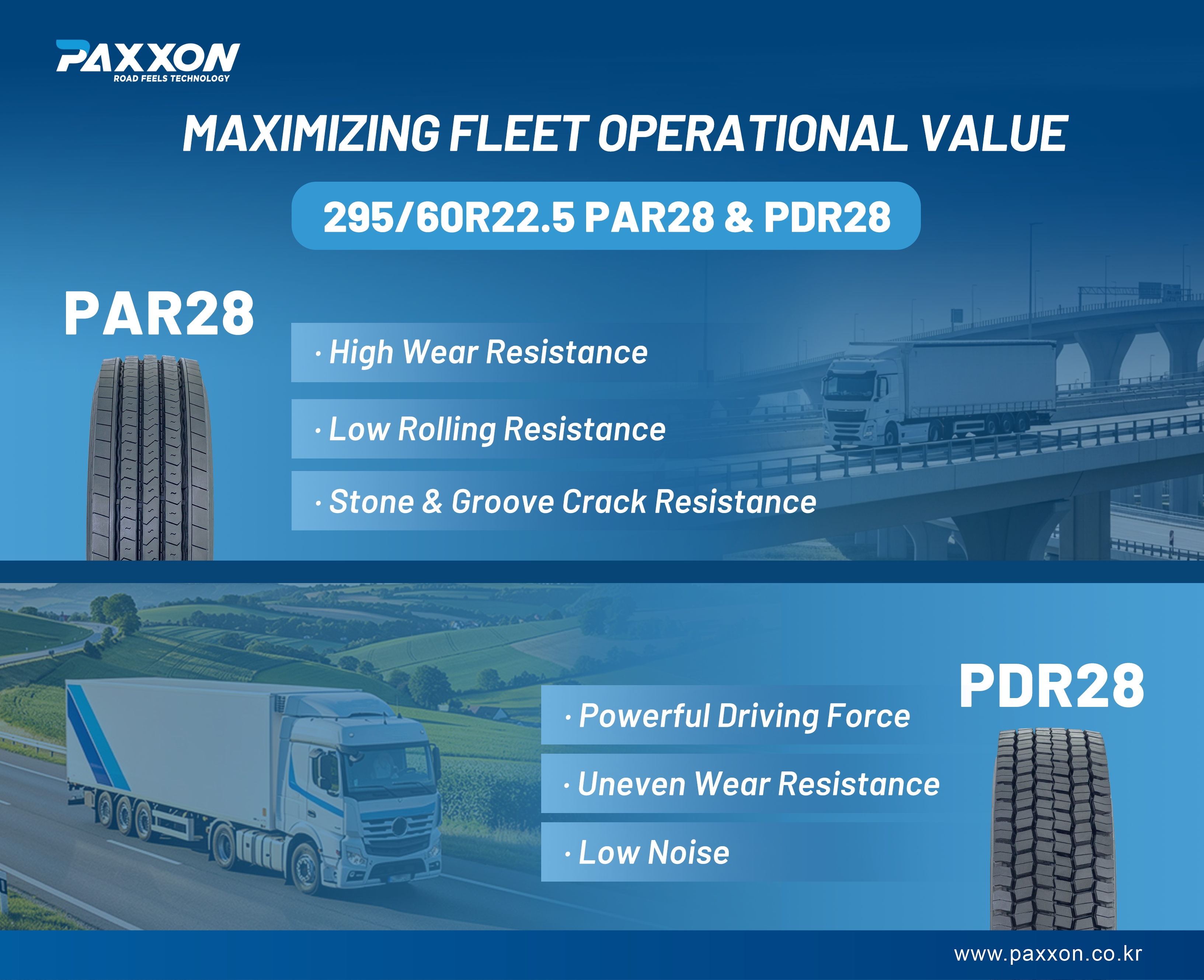 Whether for long-haul or regional transport, PAXXON 295/60R22.5 PAR28 and PDR28 provide fleets with more stable and economical tire options, making every kilometer of operation more cost-effective.